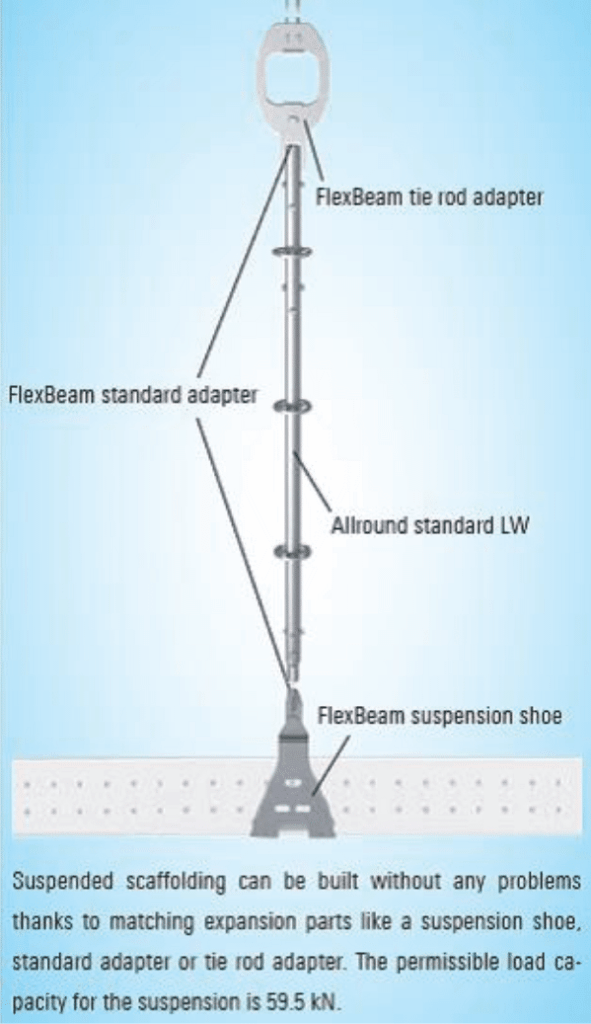 Further expansion using standard Allround components is also possible. In the case of use as suspended scaffolding. the anchor plate and the suspension shoe are available for receiving the beam. The anchor plate is intended for direct wall-plug connection to the structure.